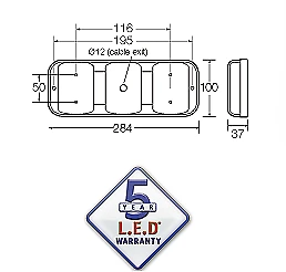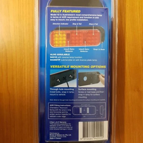 Designed to match the footprint of Australasia’s most popular rear combination lamp P/No. 85700, the Model 42 offers a fresh, modern and low profile design with all the benefits of L.E.D technology. This fully ADR compliant lamp is one of the first lamps that includes an integrated reverse function in L.E.D, making it ideally suited for small to medium size trucks, rigids and one tonne transporters. The lamp is constructed of virtually unbreakable poly carbonate with inbuilt retro reflectors, stainless steel fittings and sonically sealed with 0.5m of hard-wired cable. A unit with 9m of cable is also available making it submersible and suitable for boat trailers. The quality of the lamp is backed by a 5 year warranty with NARVA.